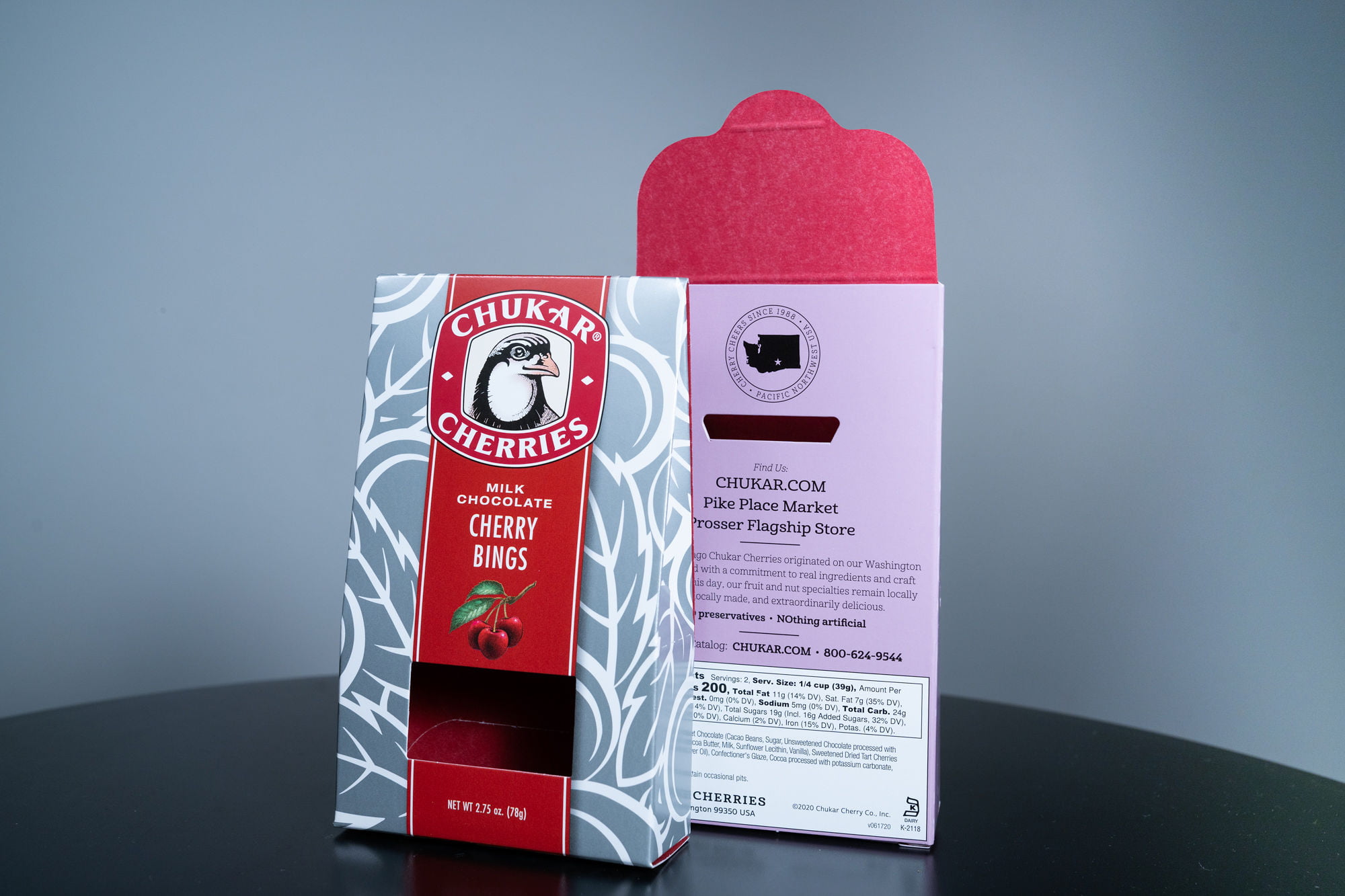 Chukar Cherries - This carton features a deep red color on the inside and a metallic silver ink on the outside. A window cut-out reveals the decadent product inside, and the carton style is a unique tent top shape.